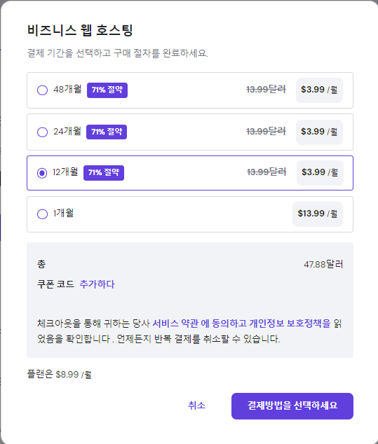 3. 비즈니스 웹 호스팅을 선택하고 12개월을 선택해주었다. 가격은 47.88달러. 매번 다른 거 같다.