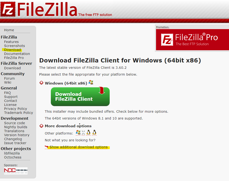 Download FileZilla Client The latest stable version of FileZilla Client is 3.60.2 Please select the file appropriate for your platform below. Windows (64bit x86) FileZilla_3.60.2_win64-setup.exe (recommended) Size: 11847936 bytes SHA-512 hash: b532c9e82016