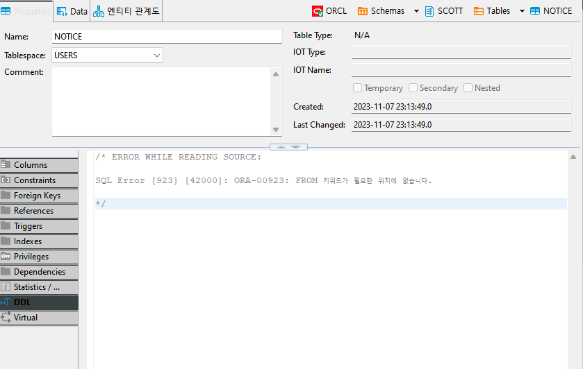 테이블을 확인해보니 아래처럼 오류가 떴다.