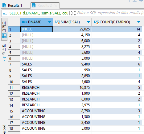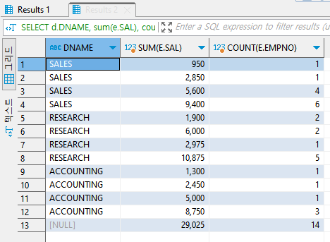 GROUP BY CUBE(d.DNAME, e.JOB) ;
